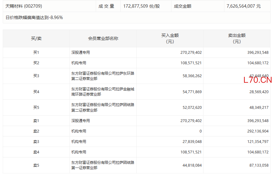 天赐材料今日跌10.00% 2家机构专用席位净卖出3.86亿元天赐材料今日跌10.00% 2家机构专用席位净卖出3.86亿元