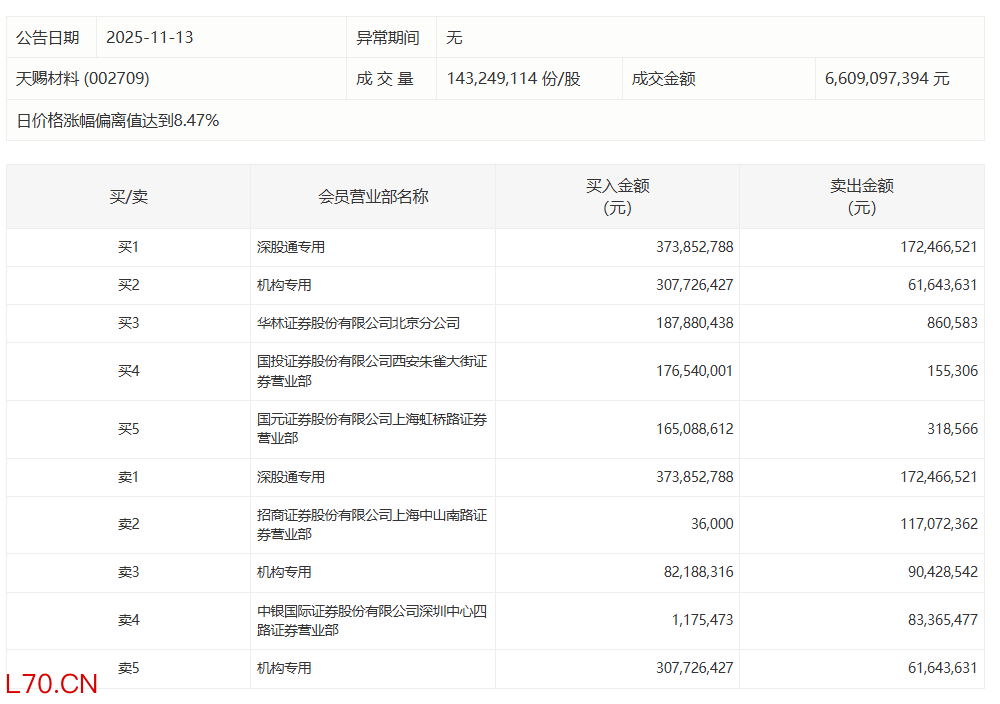 天赐材料今日涨停,1家机构专用席位净买入2.46亿元天赐材料今日涨停,1家机构专用席位净买入2.46亿元