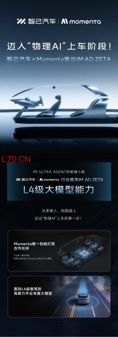 【TechWeb】3月19日消息,智己汽车日前在"超级智能体IM Ultra Agent"发布会上宣布,与自动驾驶公司Momenta联合推出智能驾驶系统IM AD ZETA。该系统搭载Momenta强化学习大模型,基于Thor高算力芯片平台开发,官方定位为"直接面向L4级自动驾驶的基座模型"。