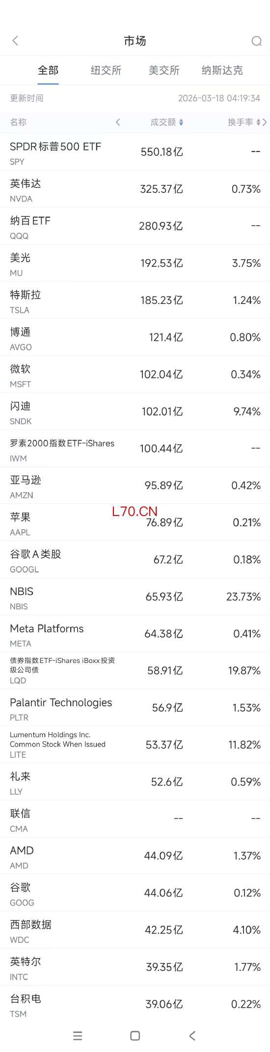 第18名西部数据收高9.64%,成交42.25亿美元。